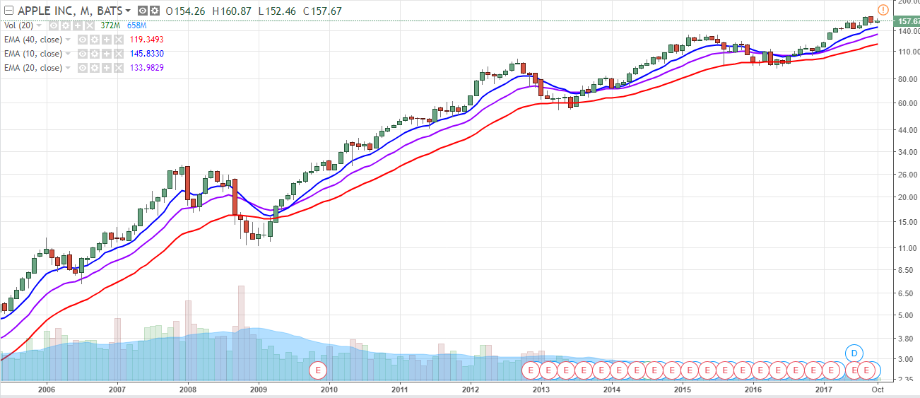 Something to take into consideration however is that when Apple’s price action is very strong, leading it to run well above its 10-. 20-, and 40- month moving averages, a reversion to the mean usually follows in the months after.